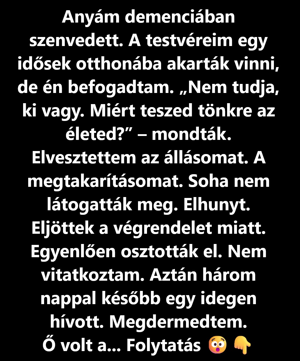 A testvéreim gyorsan gondolkodtak. Otthonok. Várólisták. Havidíjak. Számok. Mintha egy üzleti megbeszélésen ülnénk. Én hallgattam. Mert már tudtam, mit fogok mondani.